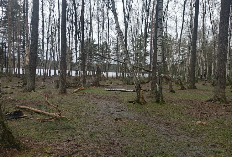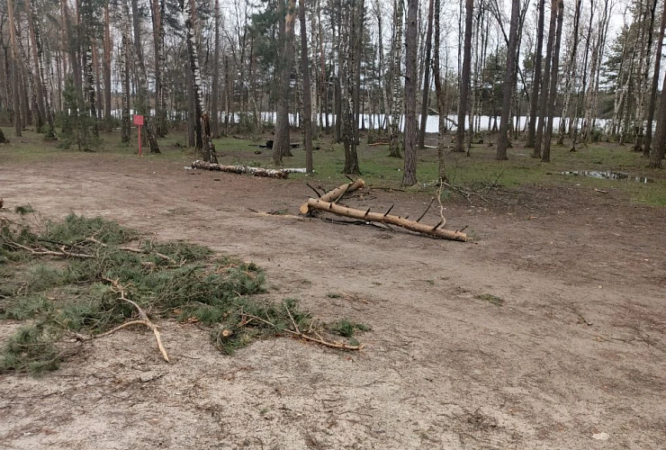 Пляж Ласковского озера свободен от воды, сломанных веток на берегу не так много. А вот добраться до места, называемого в народе мостками, пока не так просто: ещё глубоки лужи, а дорогу местами перекрывают упавшие ветки.